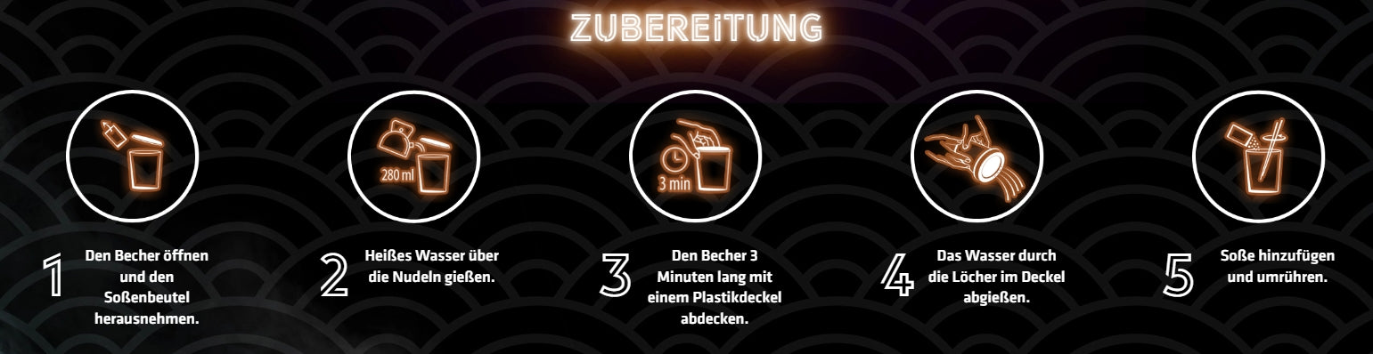 Zubereitung: Den Deckel des Bechers öffnen und die innere Abdeckung abreißen, den Beutel mit der Gewürzsauce herausnehmen. Die Nudeln mit 280ml kochendem Wasser übergießen (bis zu der auf der Verpackung sichtbaren Markierung). Den Becher mit dem Deckel abdecken und für 3 Minuten stehen lassen. Das Wasser durch die Löcher im Deckel abgießen, den Deckel öffnen und die Gewürzsauce von Beutel hinzufügen. Gründlich mischen und genießen.
